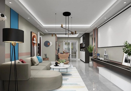 客廳以輕柔的色彩暈染開,一切色彩的比例、線條被安排得剛剛好,冷靜而克制的基路伯煙灰色邂逅溫柔治愈的皮粉色,是驚喜亦是藝術(shù)相迎,再以天空藍點綴,整個空間層次感分明,溫馨舒適。