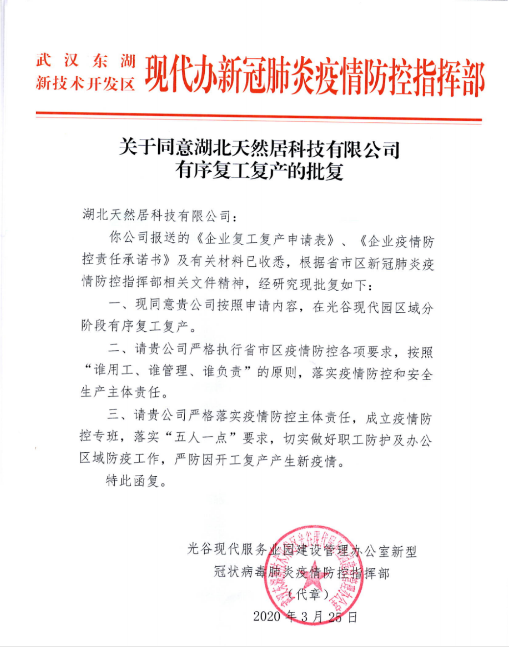 隨著新型冠狀病毒肺炎疫情防控工作的進(jìn)展,疫情的控制也逐漸走向明朗的方向,武漢不少企業(yè)陸續(xù)復(fù)工。湖北天然居科技有限公司也快速響應(yīng)防疫管控號召,在通過審批后,于2020年4月1日起正式復(fù)工。