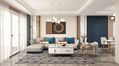 藍(lán)、橙、白三色勾勒的背景墻,很有層次感,時尚個性。一幅可以延伸室內(nèi)空間感的裝飾畫,引人遐想,同時也凸顯客廳的美感。
